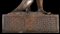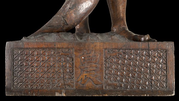 A 'nanmu' wood sculpture of a peasant with a scythe, wearing a simple blouse revealing the chest and short trousers, with bare feet, the base decorated with geometric motifs, carved with a central character 'nong' corresponding to 'farmer'
