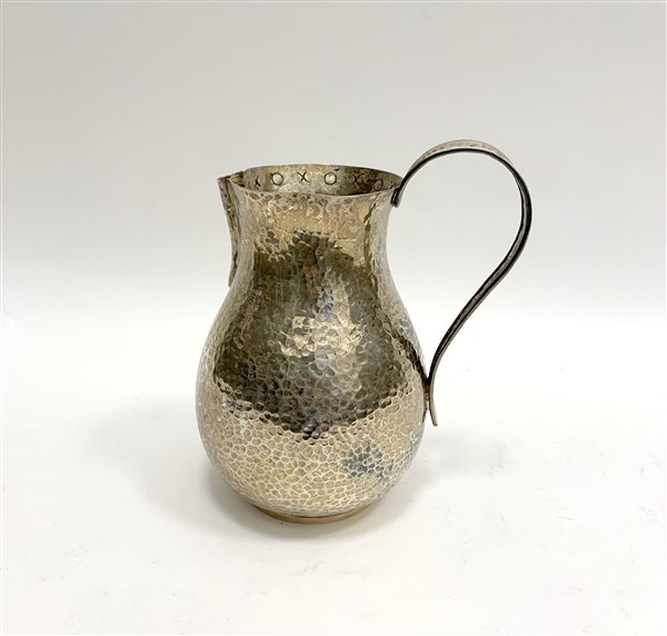Brocca in argento martellato. Titolo 800 (h. cm 20,5) (g 570 ca.) (difetti)