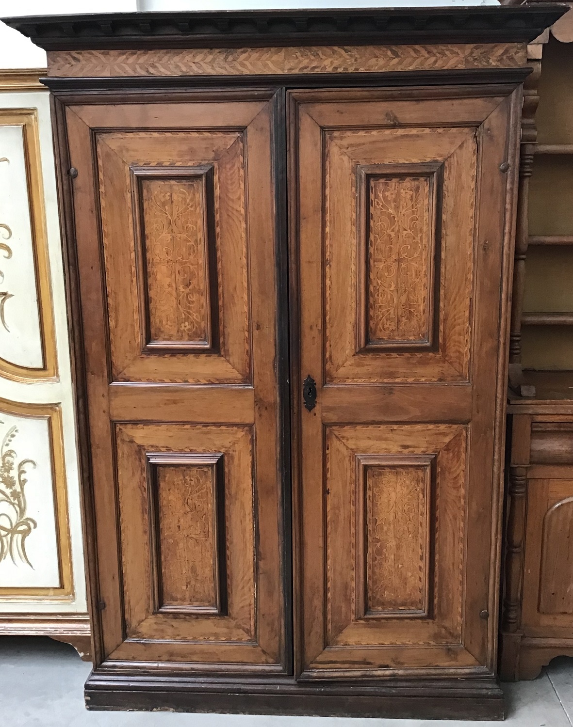 Antico armadio a due battenti con specchiature intarsiate a volute e motivi geo