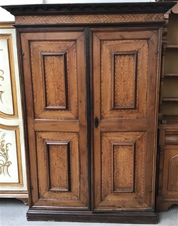 Antico armadio a due battenti con specchiature intarsiate a volute e motivi geometrici. Internamente composto da quattro cassetti e vani con sportelli e segreti (cm 141x200x71) (difetti e restauri)