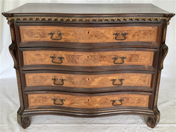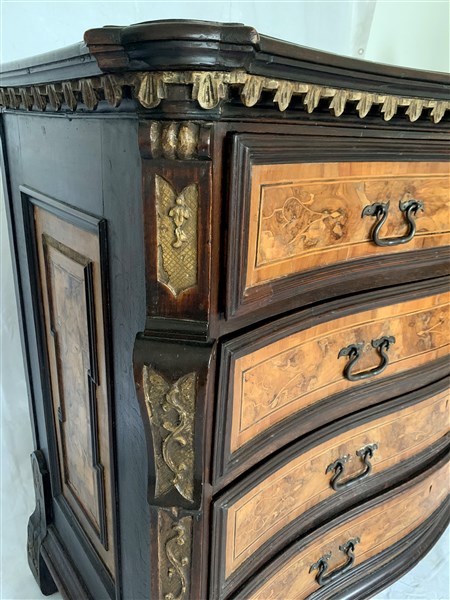 Canterano con fronte mosso a quattro cassetti radicati e filettati. Fianchi riq