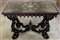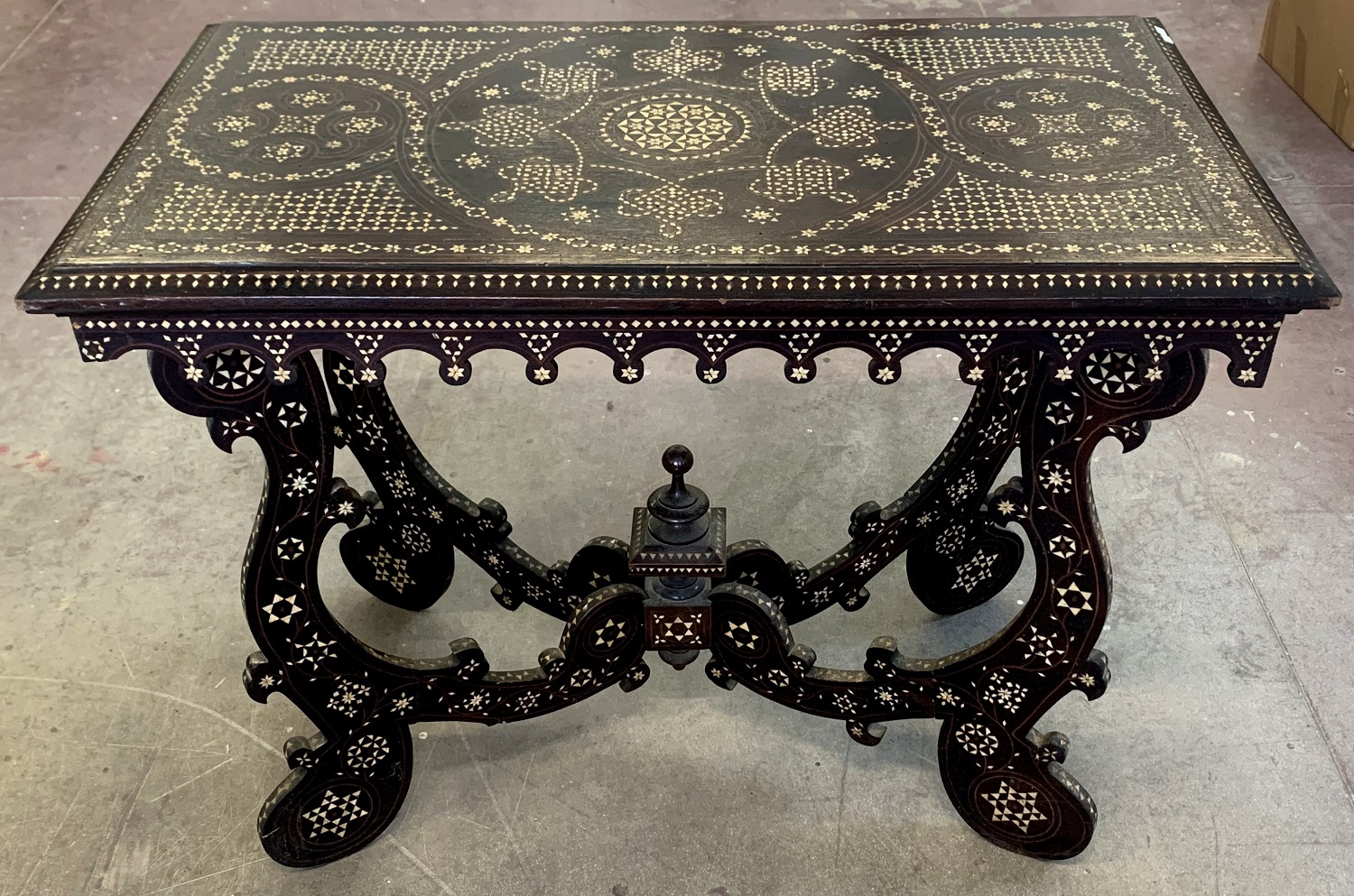 Tavolo da centro "Moresco" intarsiato in osso e filettato in legno chiaro, gambe sagomate riunite al centro da pinnacolo (cm 95x72,5x53,5) (difetti)