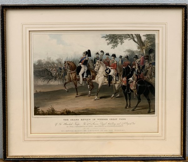Incisione a colori che rappresenta la parata del 5 giugno 1944 avvenuta a Windsor Great Park alla presenza dell'imperatore russo, del Re di Sassonia e del Re d'Inghilterra con il suo stato maggiore.