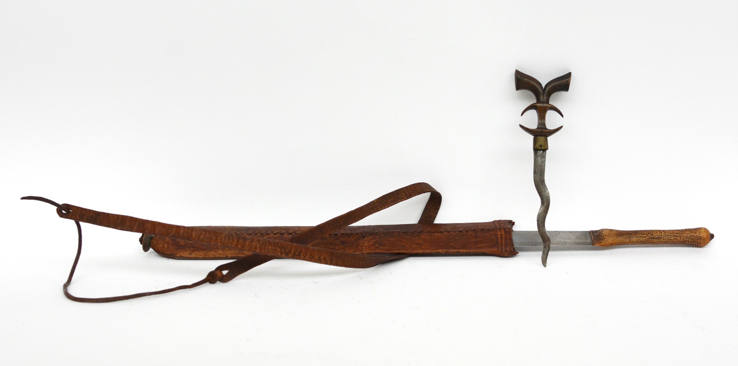 Lotto composto da stiletto da pugno con impugnatura in corno e corta lama ondulata e lunga daga con impugnatura in corno completo di cintura.