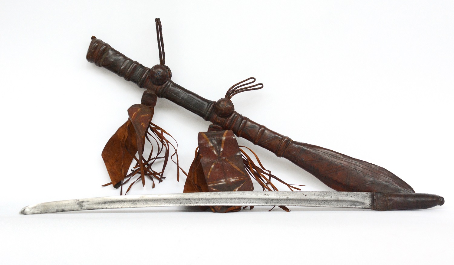 Fodero in cuoio indurito arricchito da incisioni e da pendenti in pelle operata con doppi attacchi per il cammello.