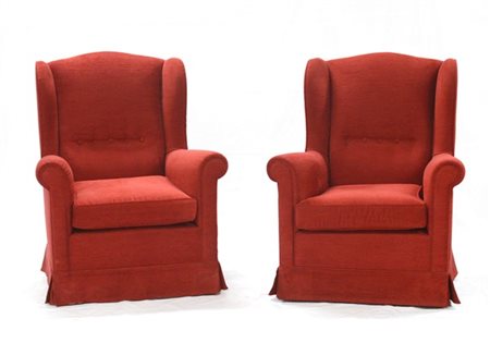 Coppia di bergere con struttura in legno massello, imbottite e rivestite in velluto rosso a coste. Italia, secolo XX. (cm 80x96x74) (difetti e restauri)