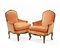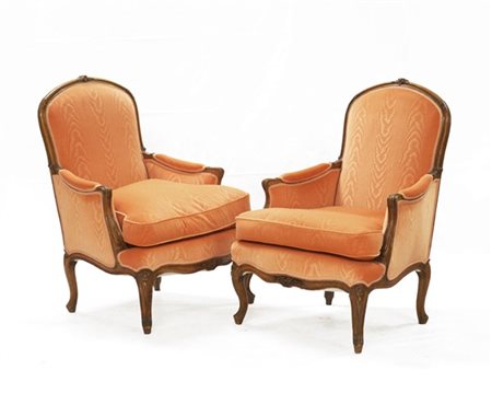 Coppia di bergère in rovere con schienale intagliato a fiori, braccioli sagomati e scanalati, gambe mosse, rivestite in tessuto color salmone (difetti)