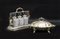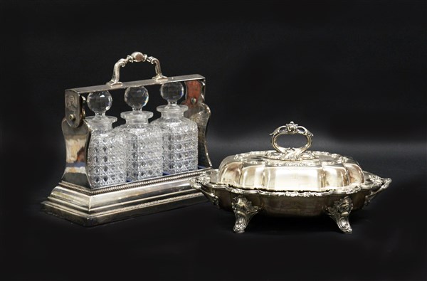 Lotto composto da uno scaldavivande ed un tantalus in Sheffield, legno e vetro