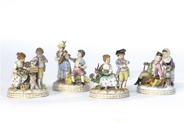 Manifattura di Dresda, lotto di quattro gruppi in porcellana policroma raffigur