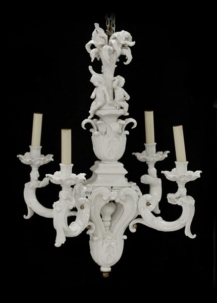 Lampadario a quattro luci in ceramica bianca, fusto decorato a volute e putti a