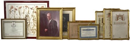 Lotto di dieci cornici contenenti foto, composizioni e onoreficenze (difetti)