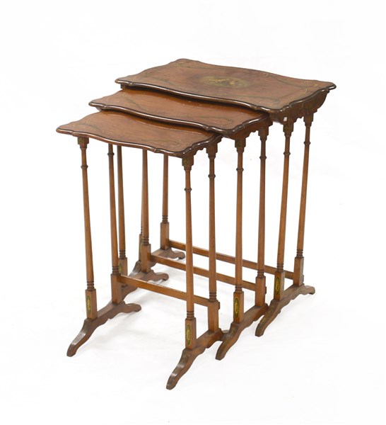 Gruppo di tre tavolini a nido in satinwood con piani sagomati e dipinti in poli