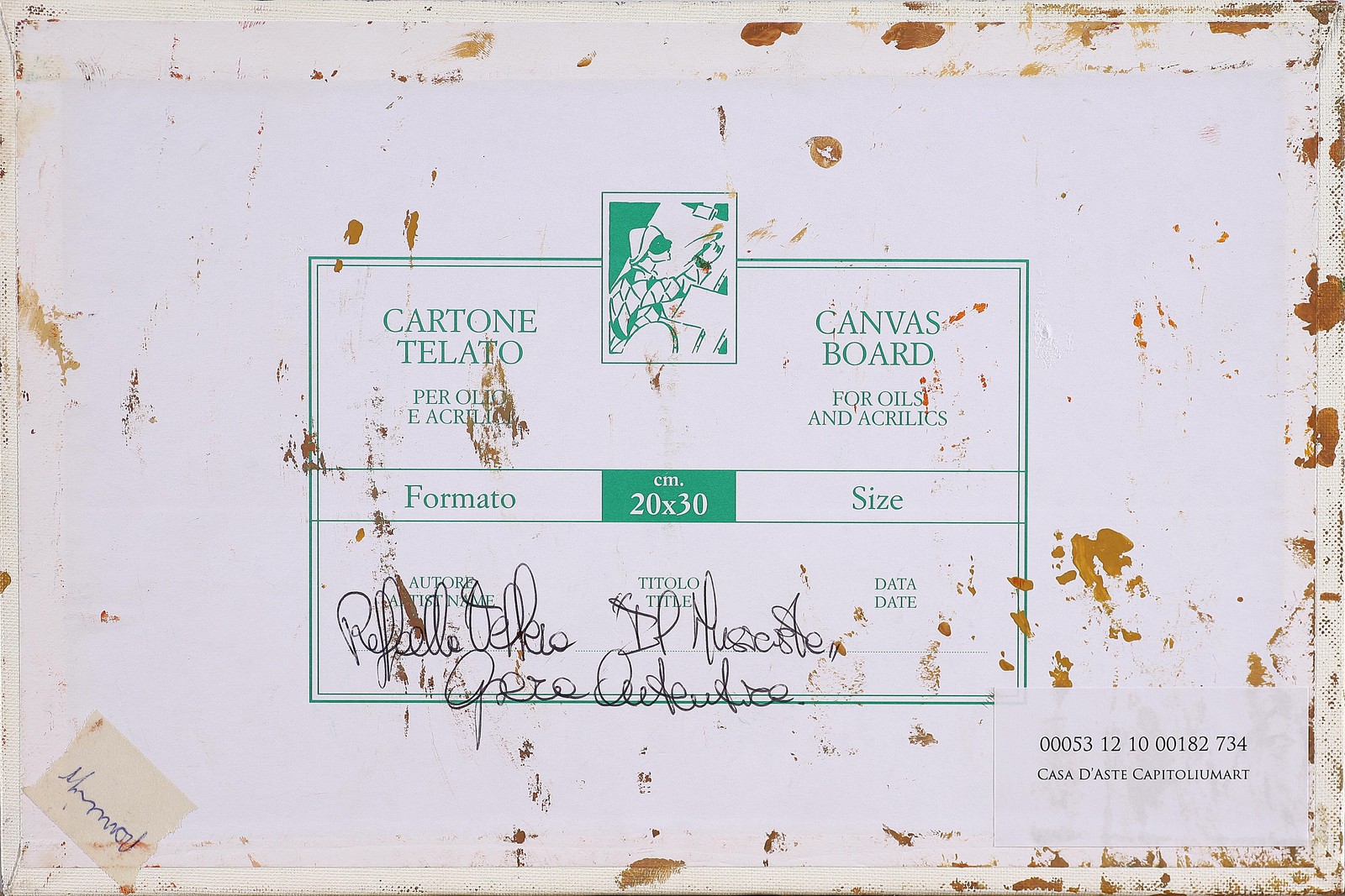 VELLERA RAFFAELLA (n. 1975) Il musicista. Olio su cartone telato. Cm 30x20. Autentica dell'artista su fotografia. Firma in basso a destra. Al retro titolo, tecnica e firma per autentica.
