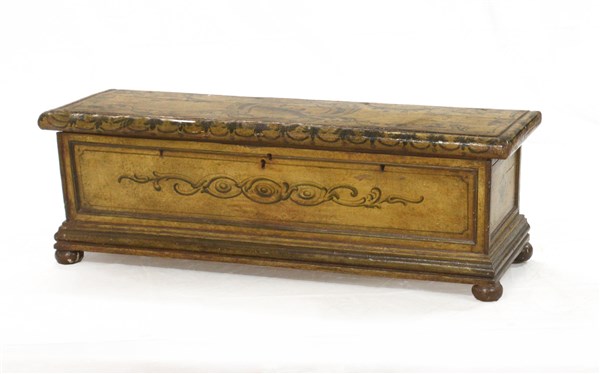 Cassapanca laccata a volute vegetali, cartiglio e girali, piedi torniti (cm 144x48x46) (difetti e restauri)
