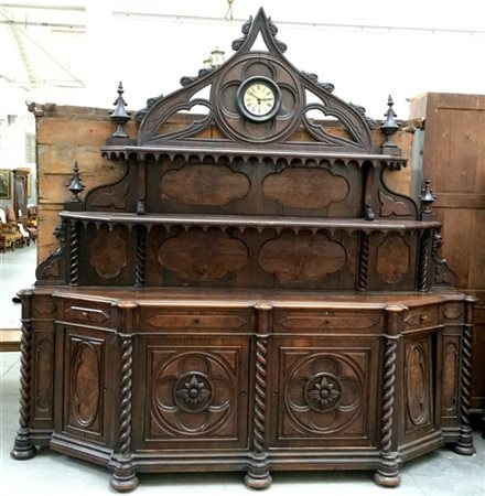 Credenza neogotica lastronata in noce con parte superiore a due ripiani e cimasa centrata da orologio. Parte inferiore a quattro ante e quattro cassetti con montanti a torciglioni. Secolo XIX (cm 290x300x70) (difetti)