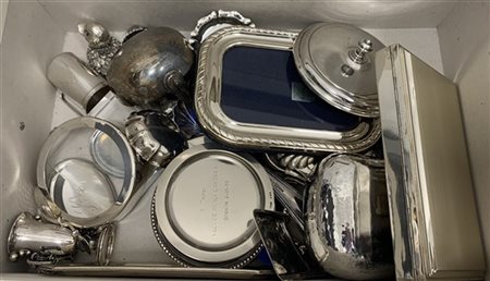 Scatola contenente numerosi oggetti in argento (g 1000 ca.) Uniti ad altri in metallo argentato (difetti)