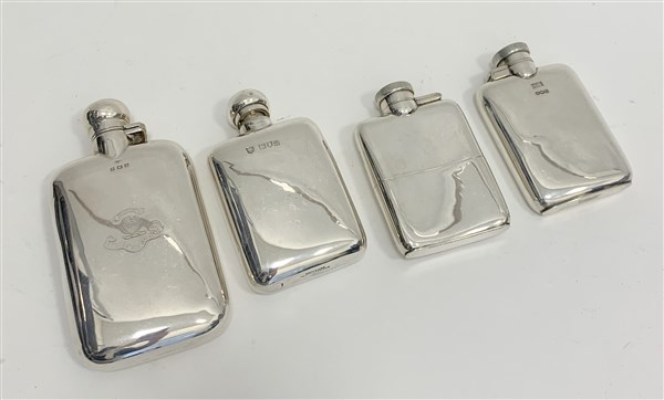 Gruppo di quattro fiaschette da tasca in argento a corpo liscio. Punzoni ingles