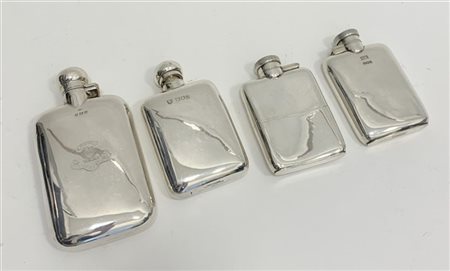 Gruppo di quattro fiaschette da tasca in argento a corpo liscio. Punzoni inglesi di diversa epoca (g 240 ca.)