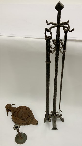 Lotto composto da una base porta attrezzi, un candeliere ed un soffietto in leg