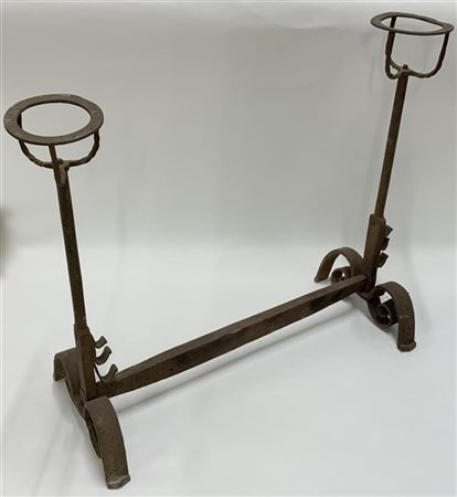 Un antico alare in ferro battuto decorato con motivi stilizzati (h. cm 70x87)