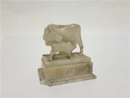 Scatola in alabastro con coperchio decorato da mucca e vitello a tutto tondo. S