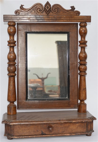Psiche da tavolo in noce con cassetto alla base, montanti torniti e cimasa intagliata, secolo XIX (cm 53x80x24) (difetti)