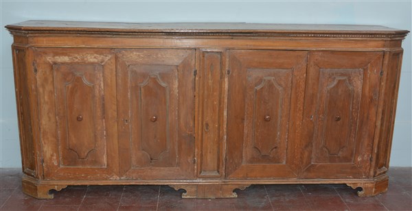 Antica credenza scantonata con quattro ante e fianchi decorati con pannelli sagomati e piedi a mensola (cm 258x114.5x55) (gravi difetti)