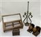 Lotto composto da una lampada in ottone, un leggio in legno, due fermalibri ed una scatola (difetti)