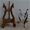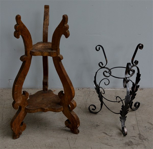 Lotto composto da due basi portavaso tripodi in legno e ferro battuto (h cm 72 e h cm 49) (difetti)