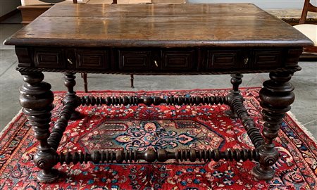 Tavolo da centro con tre cassetti sottopiano. Gambe e traverse tornite (cm 130x78x90) (in parte costruito con elementi antichi) (difetti)