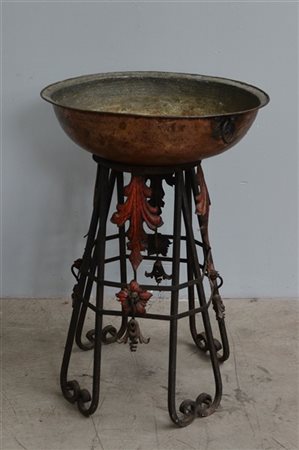 Bacile in rame martellato con base in ferrodecorata a motivi vegetali laccati r