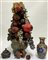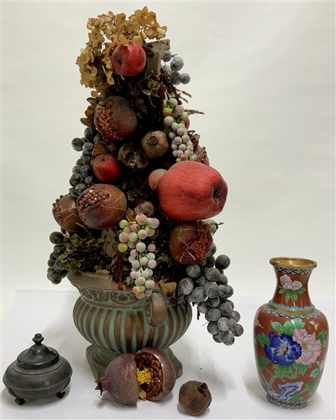 Lotto composto da un vaso in metallo cloisonné, una scatola in bronzo, un vaso in rame ed uno in cotto con frutta e fiori finti (difetti)