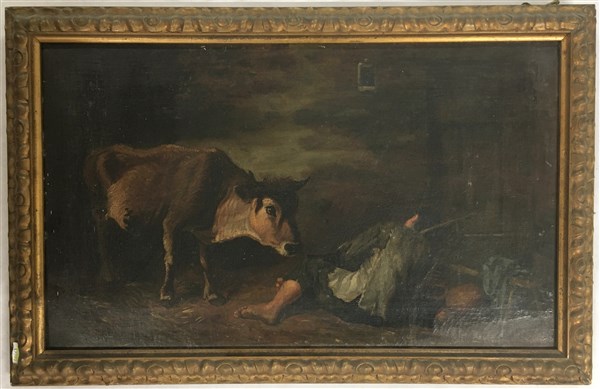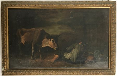 "Il riposo del pastore" olio su tela (cm 32x52) Al retro: iscrizione. In cornice