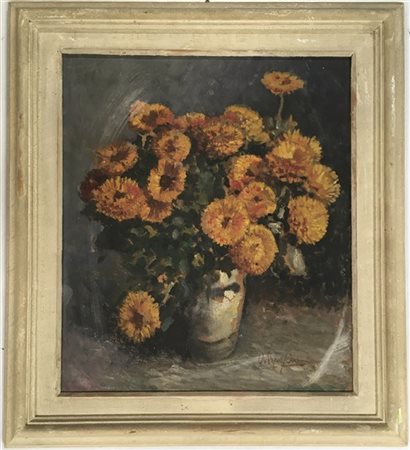 "Vaso fiorito" olio su cartone (cm 55x46) Firmato in basso a destra. Al retro: cartiglio. In cornice (difetti)