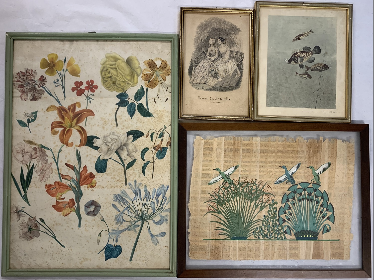 Lotto composto da numerose stampe di diverso soggetto e misura unite ad un pergamena e ad una carta di soggetto animale e floreale (difetti)