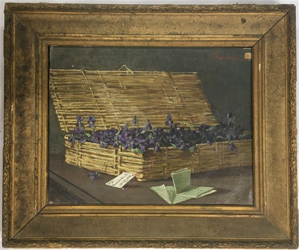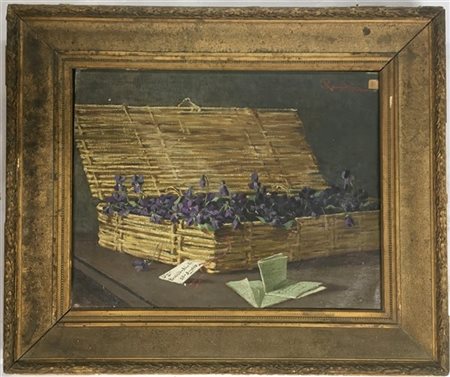 "Cesto di violette" olio su tela (cm 42x54) Firmato in alto a destra. In cornice (difetti)