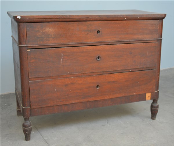 Comò lastronato in noce a due cassetti e mezzo, piedi anteriori torniti. Secolo XIX (cm 124x100x60) (difetti)