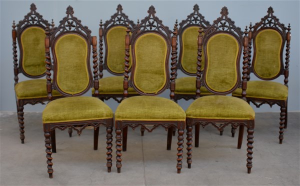 Gruppo di sette sedie neogotiche in noce con cimase intagliate e traforate a motivi vegetali. Gambe e montanti a torciglioni. Fine secolo XIX (difetti e mancanze)