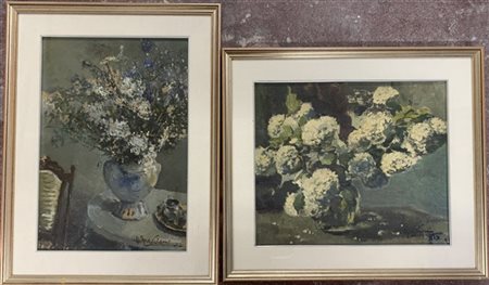 Lotto di due dipinti ad olio raffiguranti "Vasi fioriti" Firmati e datati XIX E.F. in basso a destra. In cornici (difetti)