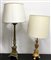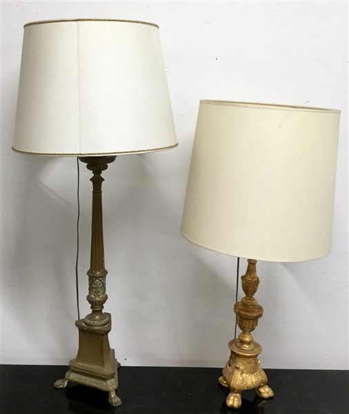 Lotto composto da due candelieri del secolo XIX in legno dorato e rame (difetti