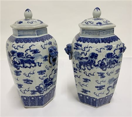 Coppia di potiches con coperchio di forma esagonale in porcellana bianca e blu decorate con leoni buddhisti tra le nuvole, anse leonine