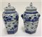 Coppia di potiches con coperchio di forma esagonale in porcellana bianca e blu
