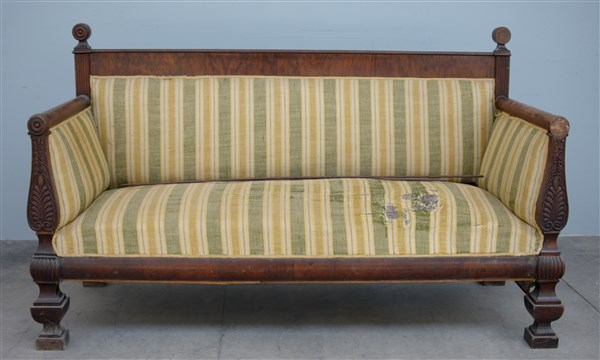 Divano in noce e radica con montanti scolpiti a foglie, piedi squadrati.Secolo XIX (difetti)