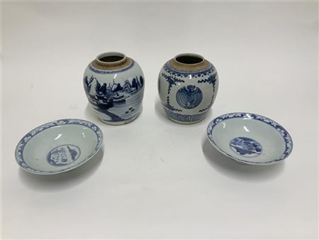 Lotto composto da due vasi e due alzatine in porcellana bianca e blu Cina, sec.