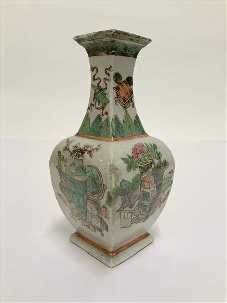Vaso a bottiglia di forma squadrata in porcellana decorata in policromia con oggetti