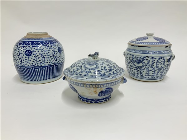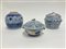 Lotto composto da una ciotola con coperchio, un vaso con coperchio e un vaso in porcellana bianca e blu
