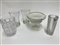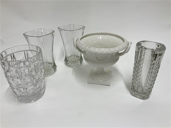 Lotto composto da quattro vasi in vetro trasparente incolore di diverse manifatture e forme, unito a un'alzata in ceramica. Secolo XX. (h max cm 25,5) (difetti)