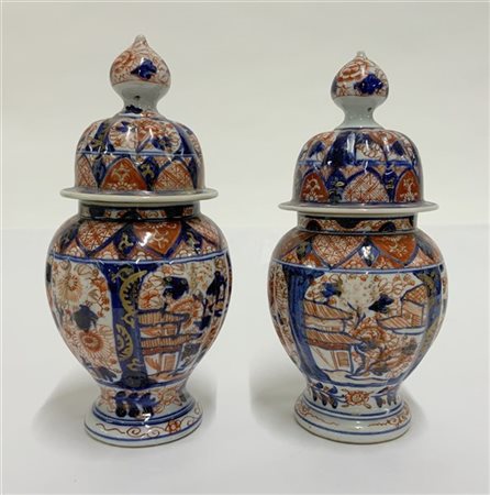 Coppia di piccole potiches con coperchio in porcellana a decoro Imari Giappone,