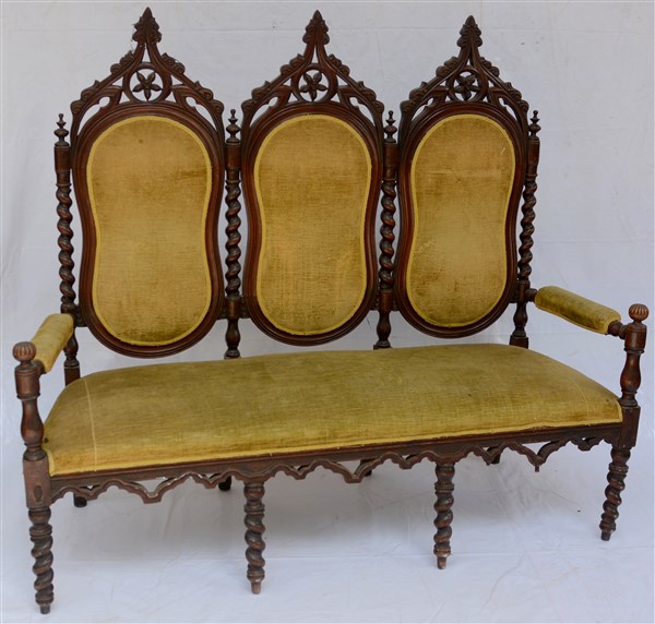 Divano neogotico con cimase scolpite e intagliate a fiori e volute, montanti a torciglione. Secolo XIX (difetti)