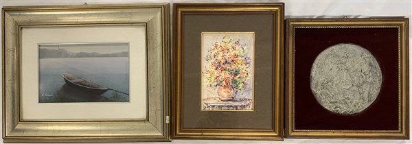 Lotto composto da un rilievo raffigurante un personaggio con animali e due dipinti di autori diversi (difetti)